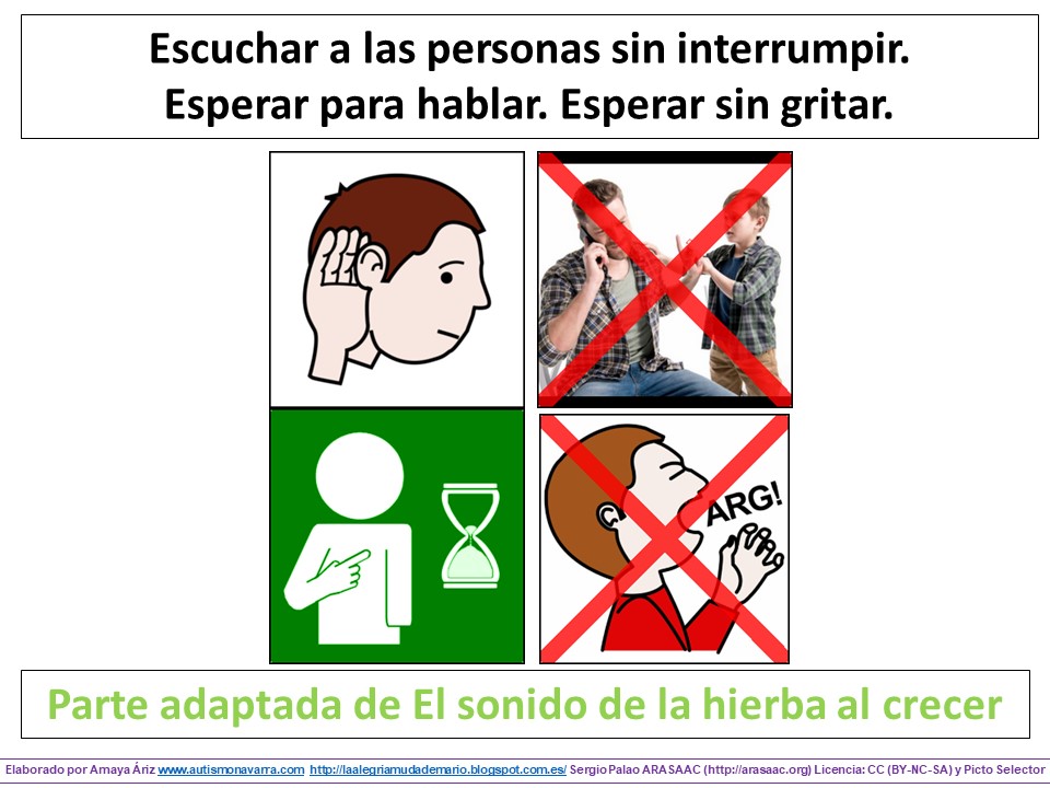 Amaya Ariz Argaya ha elaborado para su hijo Mario un material para facilitar las muchísimas dificultades que tienen en casi todos los aspectos del día a día que conlleven cualquier interacción social. El día a día es muy complicado debido a la falta de modulación, dificultades en funciones ejecutivas y problemas sensoriales. Para ir trabajando una cierta estabilidad en la interacción de cada día (en casa, con la familia, en la calle), ha preparado este material tomando como idea el material de El sonido de la hierba al crecer de Anabel Cornago ¡Esperamos que os sirva! PDF: Escuchar a las personas sin interrumpir y esperar para hablar, Amaya Áriz |